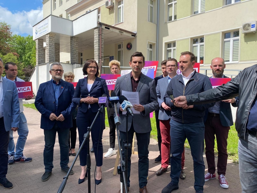 "Stoimy przed naszym szpitalem powiatowym, w którym tylko w tamtym roku na świat przyszło 800 dzieci, który każdego dnia pandemii był gotowy, aby nieść pomoc naszym mieszkańcom. Mimo tego próżno czekać na wsparcie czy choćby równe traktowanie ze strony Ministerstwa Zdrowia i Narodowego Funduszu Zdrowia" - mówił Oskar Kuliński, radny powiatowy Lewicy w Piotrkowie Trybunalskim.